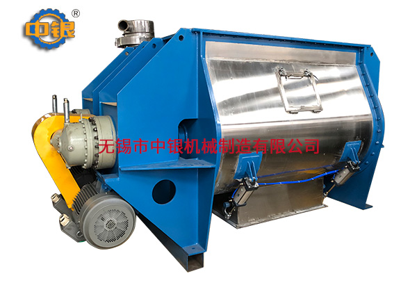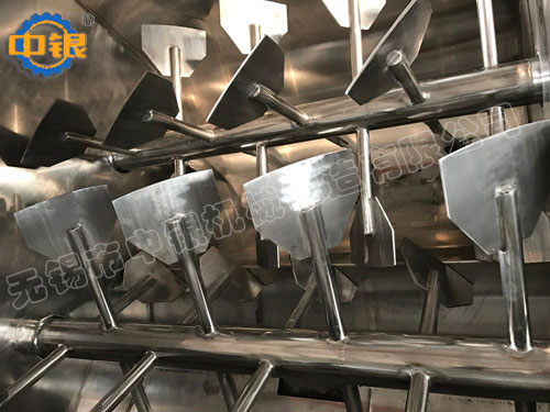 該機(jī)臥式筒體內(nèi)裝有雙軸旋轉(zhuǎn)反向的漿葉,漿葉成一定角度將物料沿軸向、徑向循環(huán)翻攪,使物料迅速混合均勻;為降低設(shè)備易損件的更換成本,槳葉葉片可做成兩片式,在葉片基座上墊一塊可移動小葉片,可直接更換磨損的小葉片,經(jīng)濟(jì)快捷; 出料形式一般為氣動(手動)翻板閥,圓弧閥門緊密嵌入筒內(nèi),與筒內(nèi)壁齊平,無物料堆積和混合死角現(xiàn)象;標(biāo)準(zhǔn)型有大開門小開門之分,大開門開口到筒邊,放料干凈快捷,殘留少。